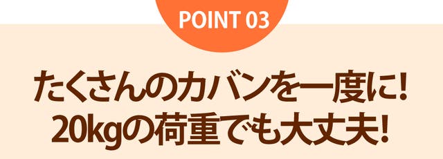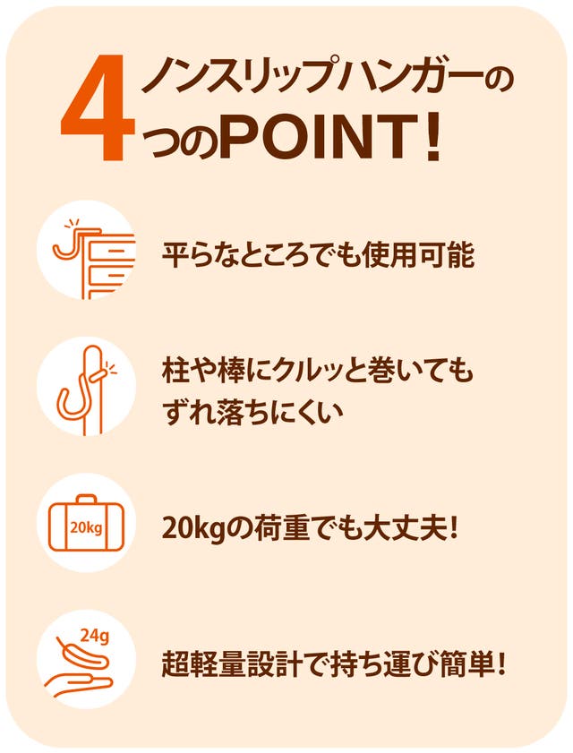 ノンスリップハンガーは20㎏の重さも耐えられる程、強力な耐久性を備えています。重い荷物も簡単にかけたり、荷物をまとめてかけたりしてもしっかり支えます!