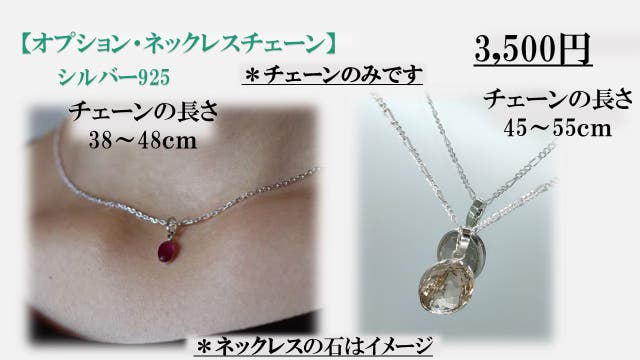 こちらはチェーンのみですので、ネックレスで着用される場合は、併せてオプション・ネックレス加も一緒にお選びくださるようお願いいたします。