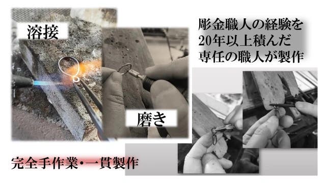 彫金職人の経験を20年以上積んだ専任の職人が製作しています。全ての工程を分業ではなく、一貫製作にて手作業で1点1点丁寧におこなっています。ブリタニアシルバーでの加工や金18・プラチナ900での加工も行っております。