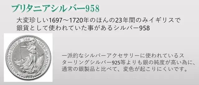 一般的なスターリングシルバーの純度は925です(1000を100%として表記される)。シルバー1000の純銀はカラーは、白っぽい白銀でとても綺麗なのですが、柔らかすぎて製品に向かないので、他の金属を混ぜて硬くされています。ブリタニアシルバーは925よりも純度が高い為に酸化(黒っぽく変色)しにくく、アクセサリーを精製するにあたり、硬さも個人的には充分あると思います。この歴史的に失われたレガシーとも言える"958"を今回のプロジェクトでモダナイズして、珍しい宝石とともに独自に復活させてカタチにさせていただきます☆