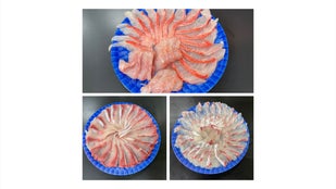 当社の冷凍機は、商品の乾燥を極限まで抑えて冷凍することができる急速冷凍機です。通常、魚などの生鮮食品は冷凍後解凍すると、ドリップといううまみ成分が流れ出してしまうことが多いのですが、この機械を使うとドリップは出づらく、色味や風味、照りなど元の状態に限りなく近く復元します。
