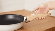2.ハンドルのグリップ部分をフライパン本体のふちにしっかり挟むようにセットします。