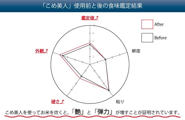さらに、こめ美人の使用前と使用後とでお米の食味鑑定をおこなったところ、こめ美人を使ったお米の方は外観・食感がよくなり、弾力・艶がアップしたことが証明されました。お米の専門家いわく、これだけの数値が上がることはすごいらしいです。