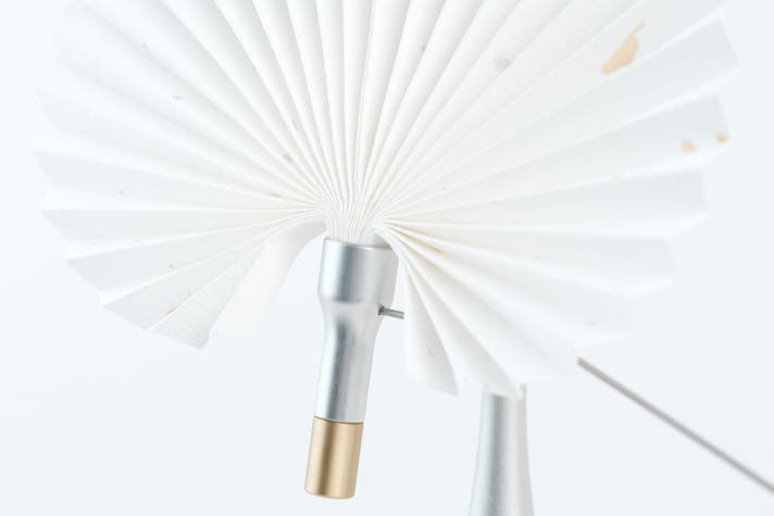 "Kami"は、アートペーパー、アルミ合金、銅、ステンレスといった素材を組み合わせて生まれました。それぞれの素材は、重さと形の理想的なバランスを追求し、ひとつひとつ丁寧に選び抜かれています。