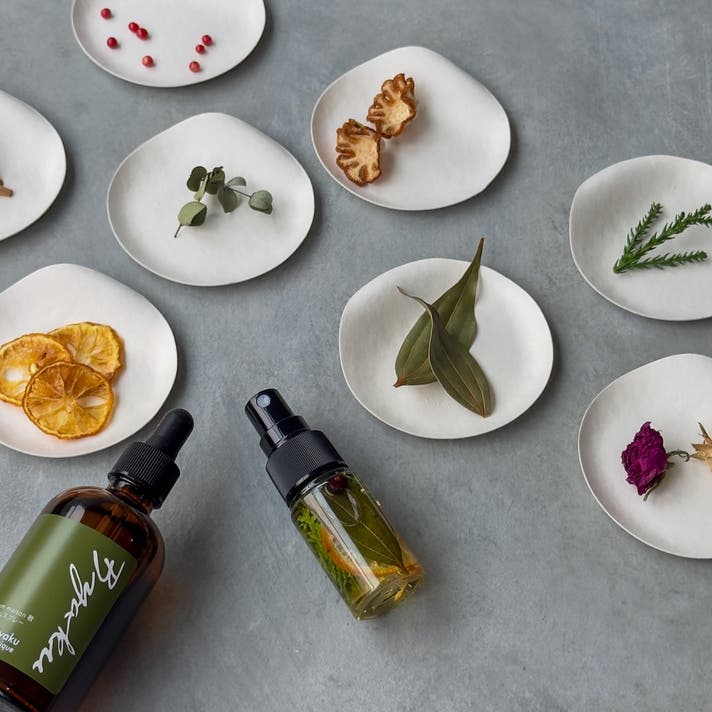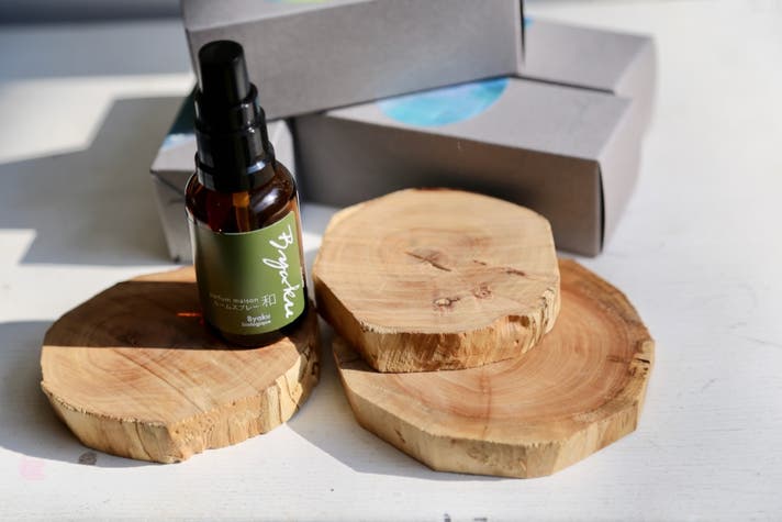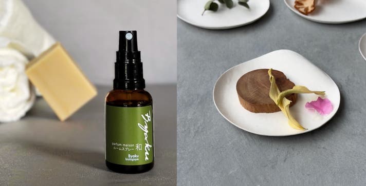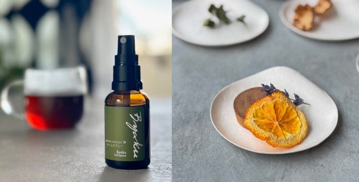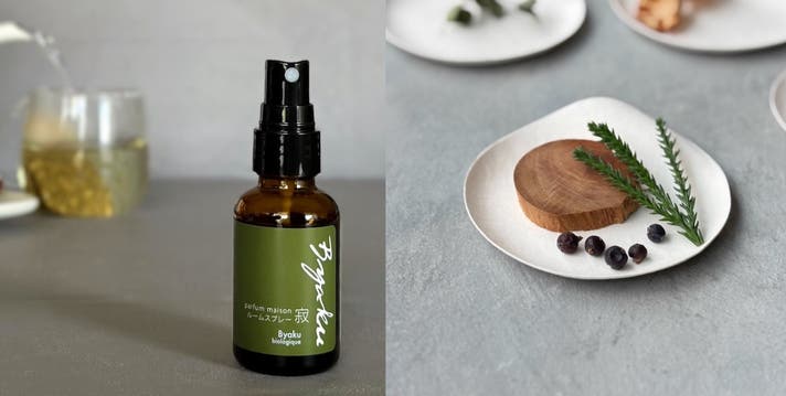 - 日本先行販売では京都発の、天然由来100%のオーガニックミストByakuの香りも提案です。