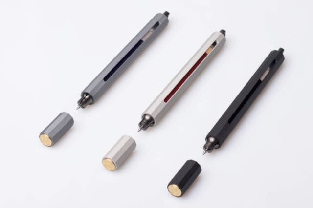 1つは・・・ANTOUのベストセラーアイテム、Pen C (ペン・シー)。日本の文具店で販売しているボールペン芯、ゲル心、ローラーボール芯やフリクション芯などさまざまな替え芯が使える優れものです。今回は定番色のブラック、シルバーとガンメタルの3色をご用意しています。