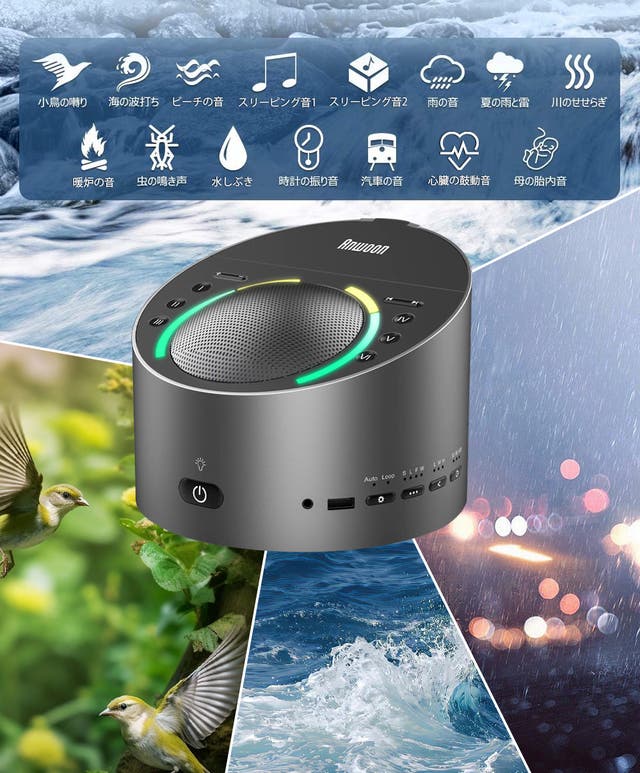 Anwoon TianTin1は3種のノイズ音、3種の周波音、2種のファン音、2種のスリーピング音と14種の自然音(川のせせらぎ、夏の雨と雷、海の波打ち、ビーチの音、水しぶき、雨の音、小鳥の囀り、飛行機客室の音、心臓の鼓動音、時計の振り音、汽車の音、母の胎内音、虫の鳴き声、暖炉の音)が用意されています。