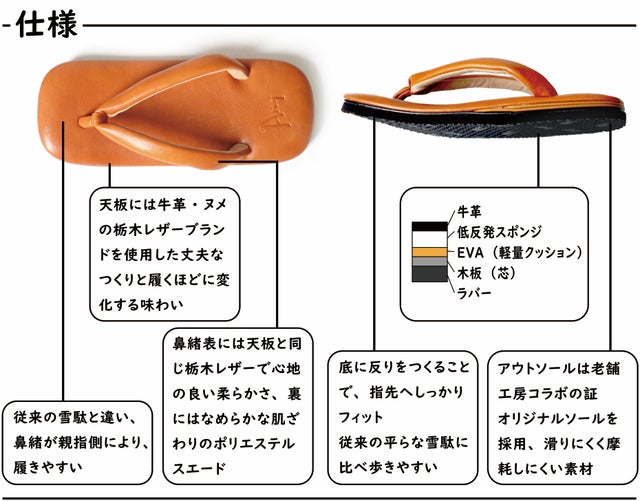 - 奈良の老舗雪駄工房とのコラボにより、耐摩耗性に優れたオリジナルソールを使用