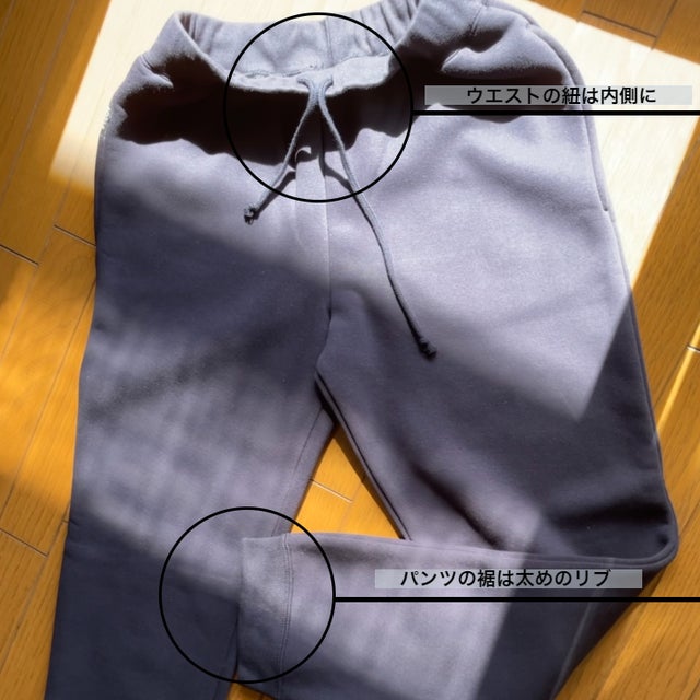 ウエストの紐は内側に、裾は太めのリブ、表面は綿100%の毛玉になりにくい素材で伸びにくい。