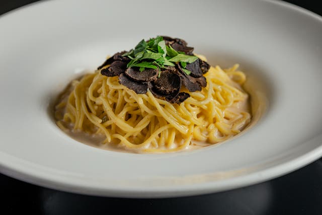 そして、「黒トリュフとウニの濃厚クリームパスタ」は、削った黒トリュフをたっぷりまぶした、贅沢な一品。