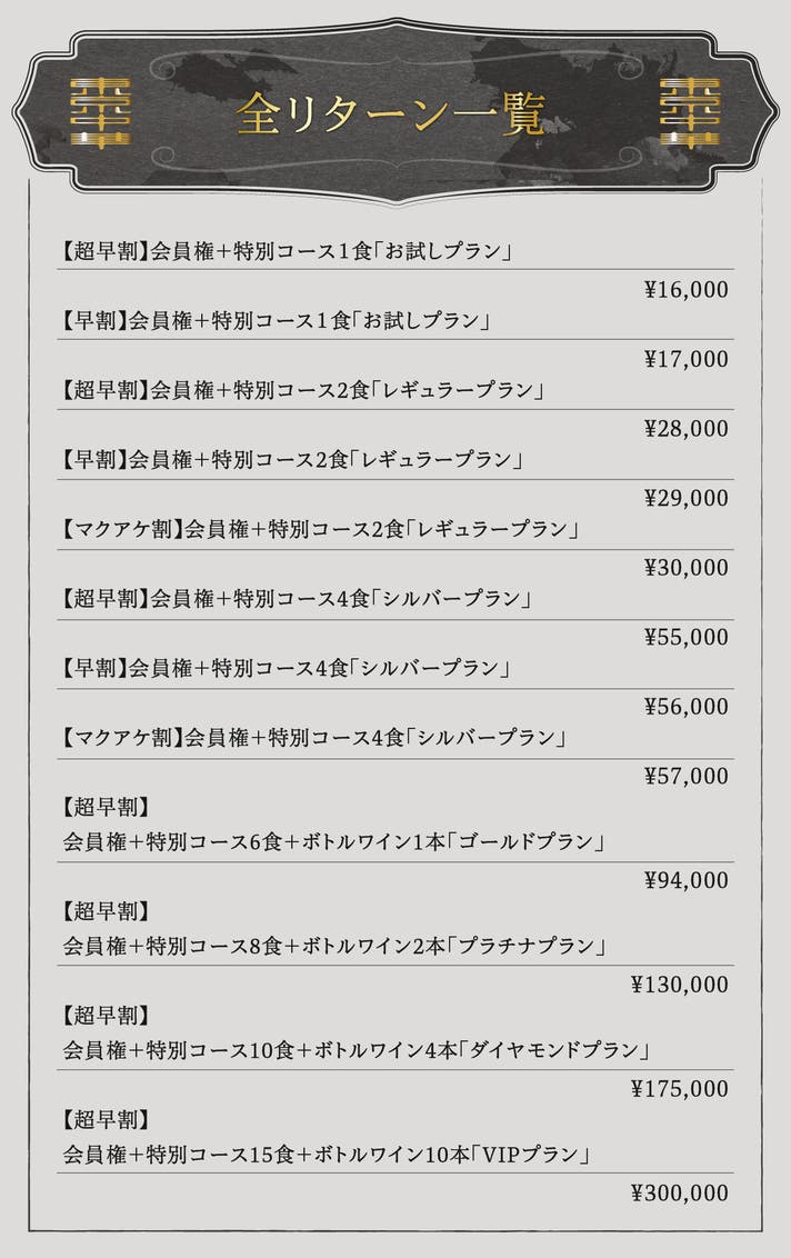 【通常】会員権+特別コース8食+ボトルワイン2本「プラチナプラン」