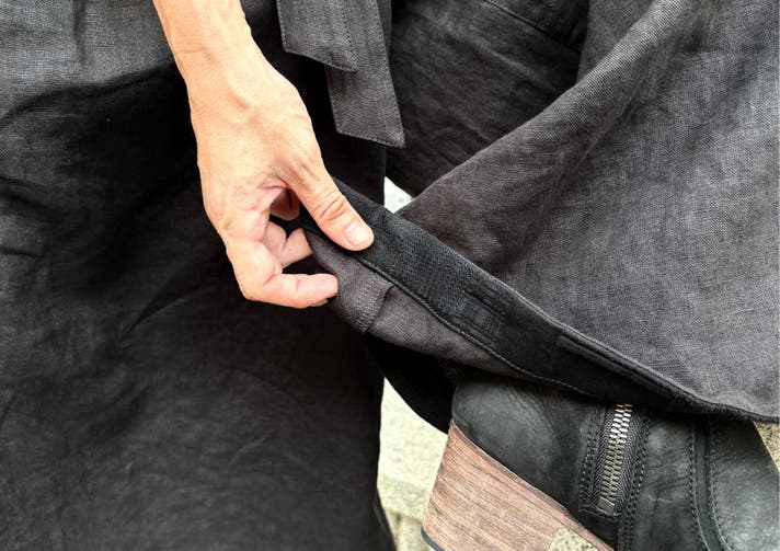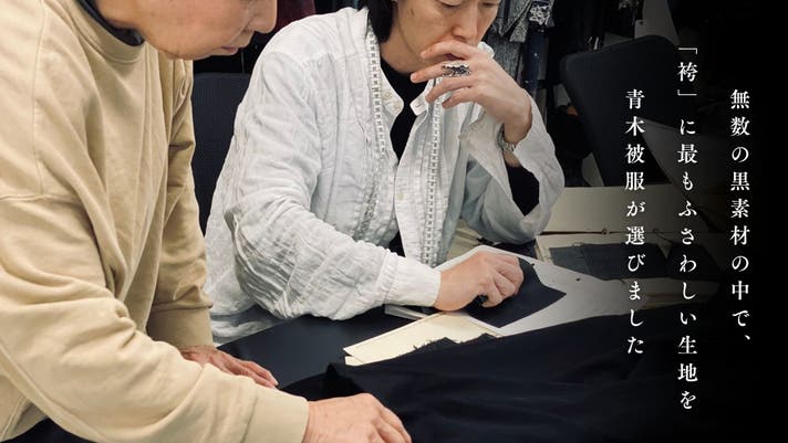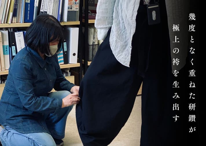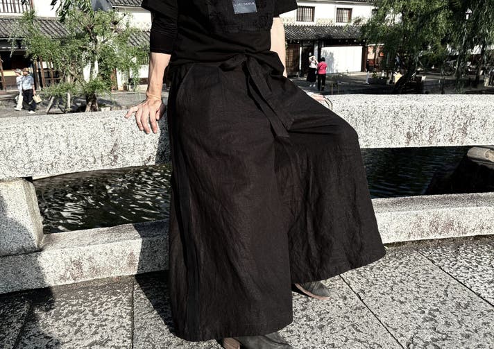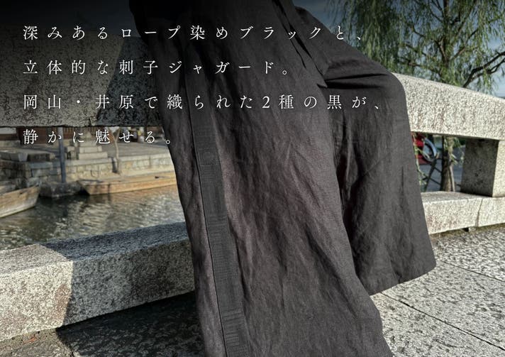 岡山の職人が叶える、極上の黒袴。圧倒的な立体ドレープの形を縫うのが難しいジャガードデニム・フレンチリネンを用いて実現する縫製技術。