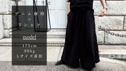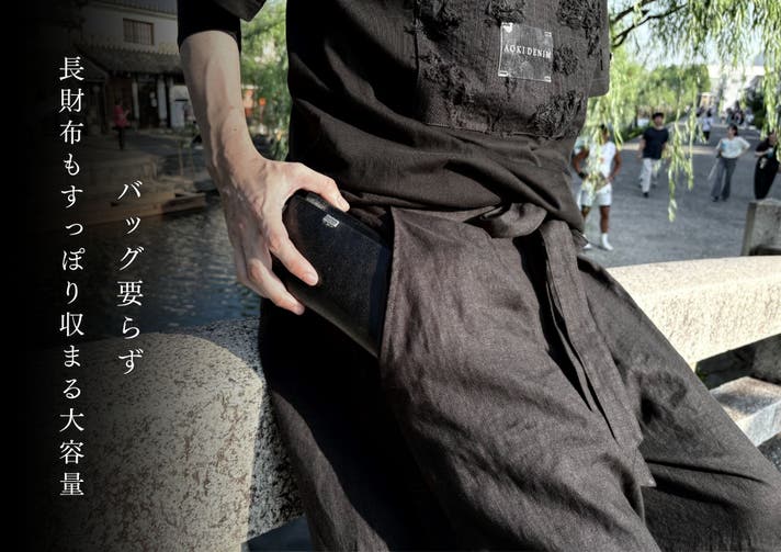 和服の象徴ともいえる袴の構造をベースに、岡山の熟練デニム縫製職人の手によって再構築した「現代の黒袴パンツ」です。