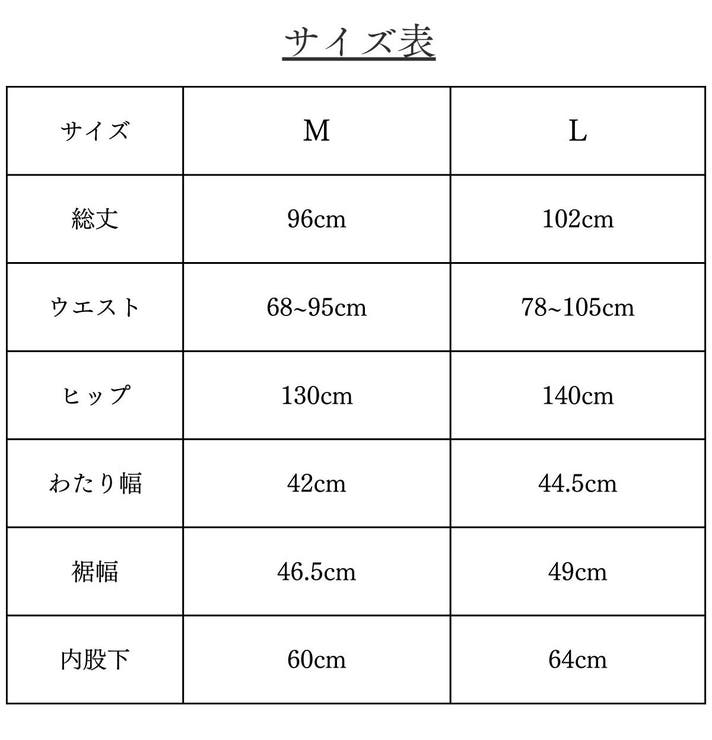 A. MとLの2サイズ展開です。後ろウエストのゴム仕様に加えて「一体型帯ベルト」で調整可能なので、幅広い体型にフィットします。