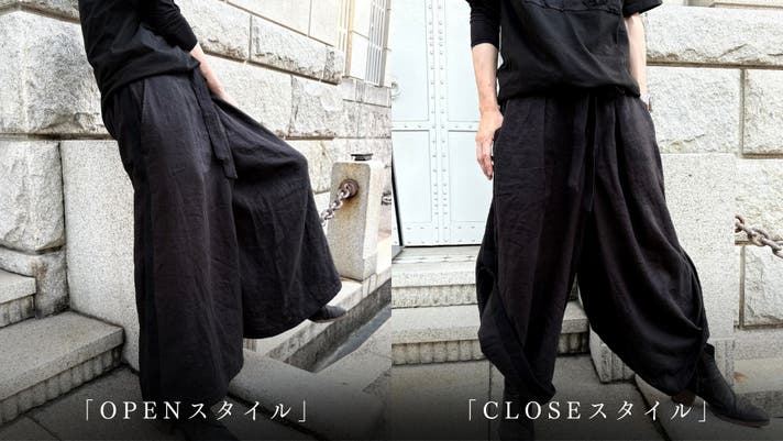 サイドに施した磁石機構により、ワンタッチで2つのスタイルを楽しむことができます。裾をおろして本来の袴の形を楽しむことも、裾を上げることで爽やかに履きこなすこともできます。