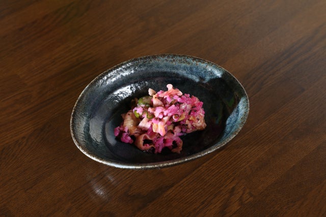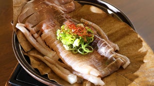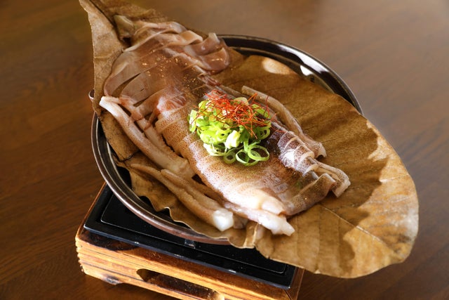 青森はイカの漁獲がとても盛ん! 青森は三方を海に囲まれ、中央には陸奥湾と、地理的に恵まれており、プランクトンが多く発生する豊かな漁場なので、イカの味も格別! 当店ではごろと味噌を和え、朴葉の上で焼くことで、香り高くさらに上品にコリコリしたイカの食感をお楽しみいただけます。