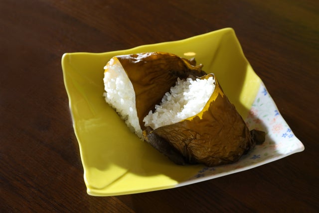 若生とはやわらかい一年物のこんぶ。津軽半島沿岸で春一番のこんぶに塩をまぶし、半乾燥させたもの。この若生こんぶを海苔代わりにして包んだおにぎり。ほどよい塩味と磯の香りが特徴。青森を代表する作家、太宰治の愛した味です。