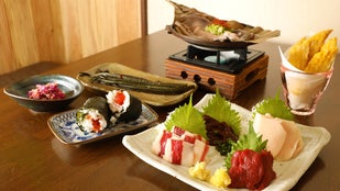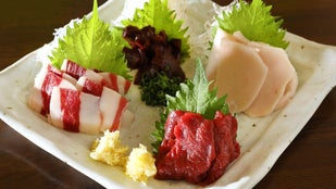 青森で馬肉!? と思われるかもしれませんが、生産がとても盛んです! 古くから県南を中心に馬産地として発展し、一般的に馬肉が食べられてきた歴史があります。赤身は肉の繊維を壊さぬよう冷凍せず、肉本来の旨味と食感をお楽しみいただけます。またレバー刺しとたてがみ刺し、フタエゴは滅菌処理のため冷凍しての提供となりますが、馬肉特有の臭みが一切なく、旨味と食感を存分に感じていただけます。