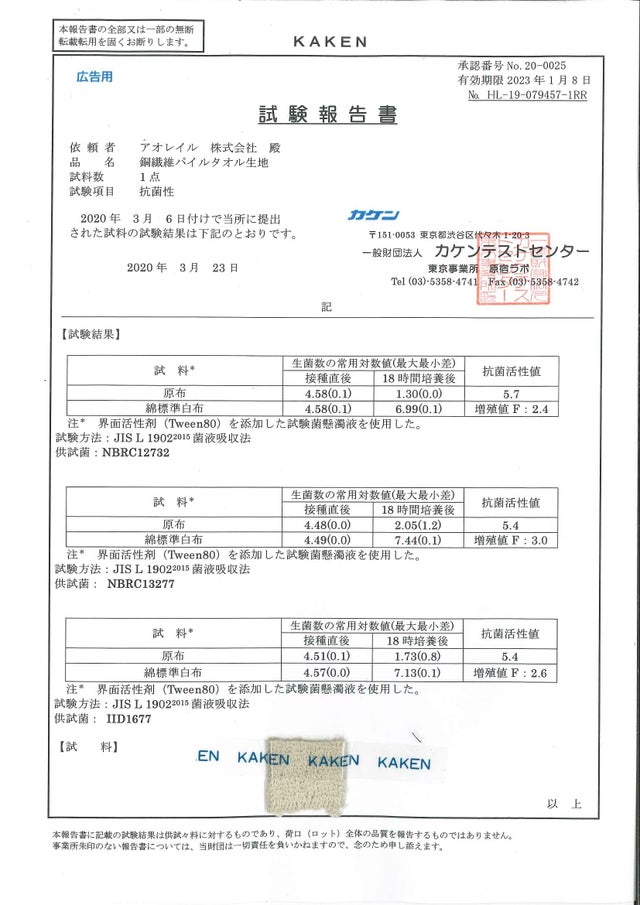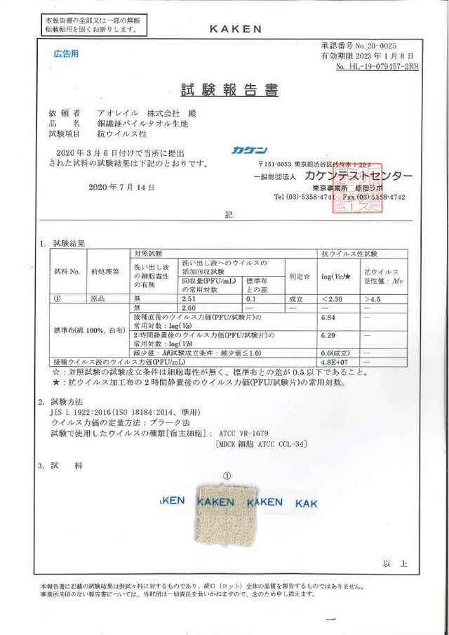 このタオルでは抗菌試験だけではなく、抗ウイルス試験まで実施しております!!!