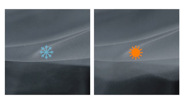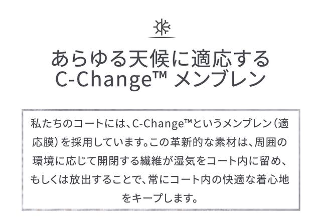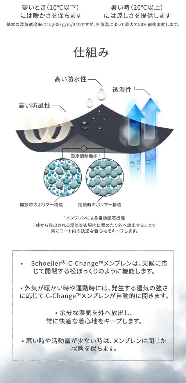 コートの透湿性は外気温により、50%まで増減します。そのため、気温が変動する季節の変わり目(10°Cから20°C)にも適したコートとなっています。