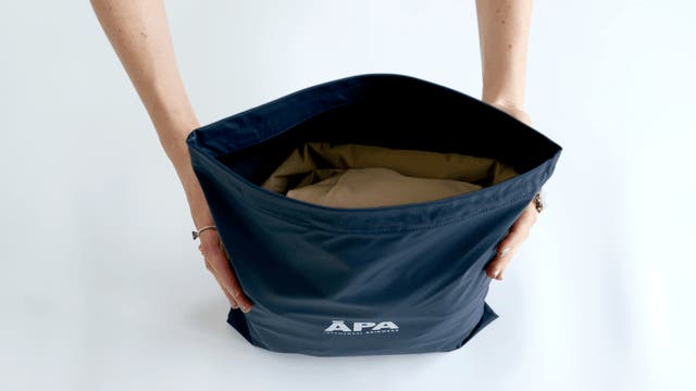 APA × Dzaino アップサイクルコレクションは、私たちのコートの余剰材料を使用して作られたミニマルで実用的なトラベルポーチです。高品質で軽量、かつ防水性があり、すべてヨーロッパで生産されています。