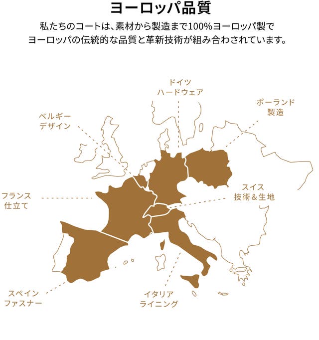 私たちのコートは、卓越した生地や細部へのこだわり、職人の技術によって、100%ヨーロッパで製造されています。ドイツ、ポーランド、イタリア、フランス、スペインの優れた工場と提携しています。