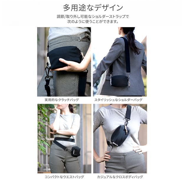 調節と取り外しできるショルダーストラップを採用。以下のような使用が可能。