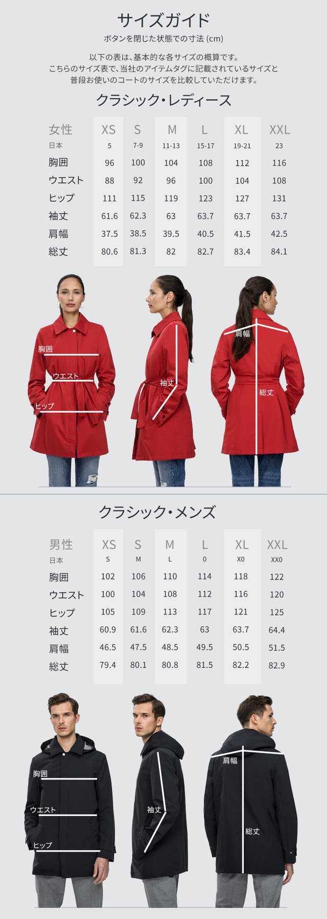 私たちのコートは、男性にはスリムフィット、女性にはスタンダードフィットを提供しています。