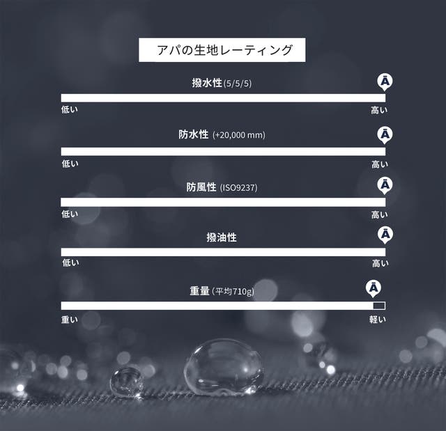 防水性は20,000mmで、防風性も兼ね備えています。また、極めて高い撥水性により、セルフクリーニング効果もあります。