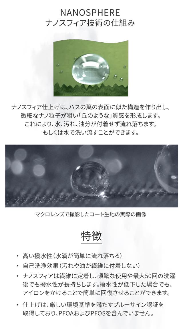 化学コーティングの代わりに、私たちはスイスのSchoeller®社が開発した高性能なナノテクノロジー生地を使用しています。この生地は、軽量で高級感があり、洗濯機で洗えるうえ、優れた撥水性を持っています。