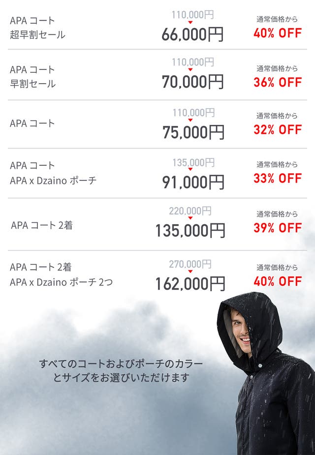 Makuakeに記載されている価格には、送料と日本の消費税(10%)が含まれています。すべてのコートはヨーロッパの倉庫から発送されます。