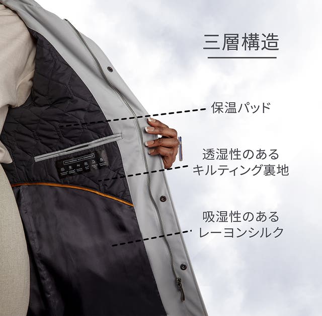 高級ビジネススーツの職人技にインスパイアされたこのコートの内側には、3層構造が施されています。透湿性のある層、吸湿性のある層、そして保温性のある層が組み合わさり、暖かさ、透湿性をバランスよく保ちます。