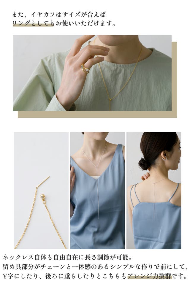 イヤカフのアレンジ、ネックレスのアレンジで6WAY!このイヤカフ&ネックレスのセットで、耳元、首元と自由自在にスタイリングができます。