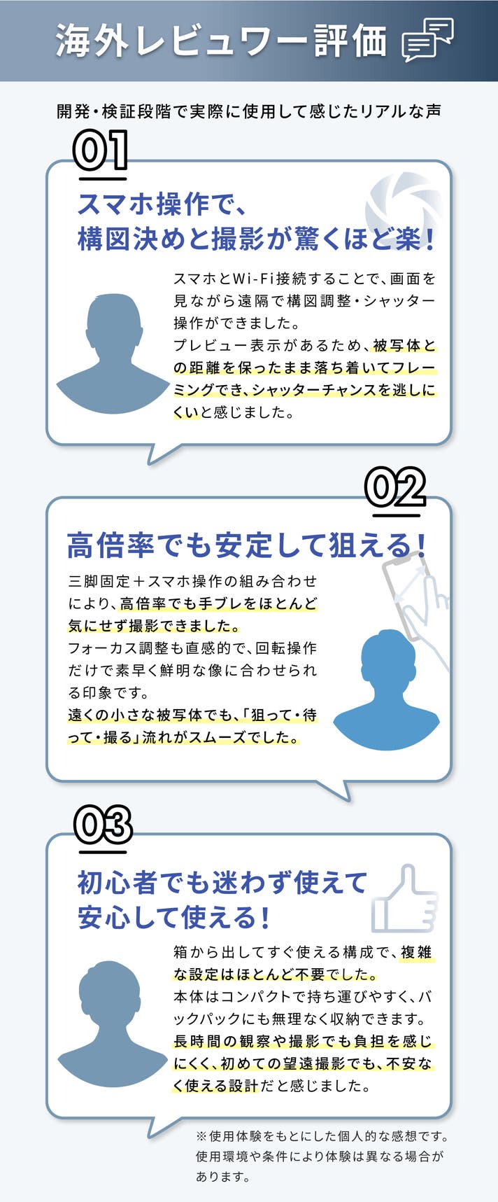 - iphoneとAndroid両方のデバイスでスムーズなWiFi接続による遠隔撮影が可能。