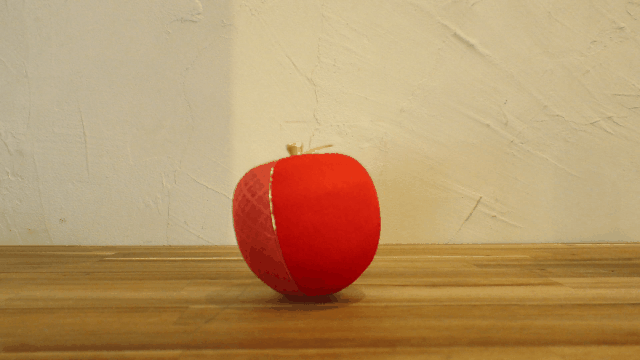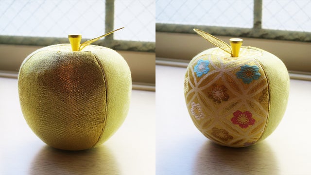 その伝統の木目込み技術によって、リンゴの美しさを表現しました。5面にそれぞれ西陣織の異なる柄の生地を用いて、揺れるたびに違う表情を楽しめます。