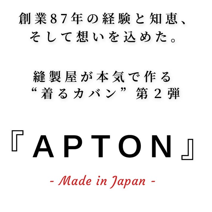 3年前に他界した先代である、会長(父)から受け継いだ「モノ作り」の魂を今後も忘れずに製品作りに繋げていく決意を固めました。国内縫製にこだわり続けてきた父の想いにも応えられるように精進しますので、日本の縫製職人の作る『APTON』を応援どうぞ宜しくお願い致します。