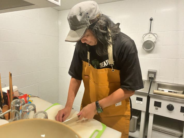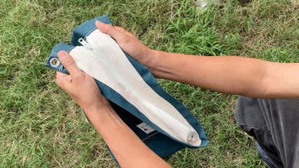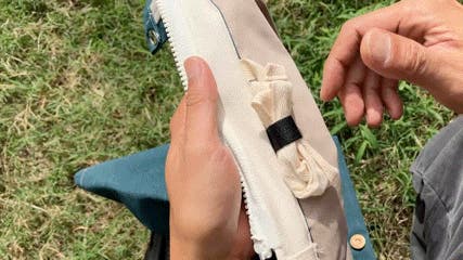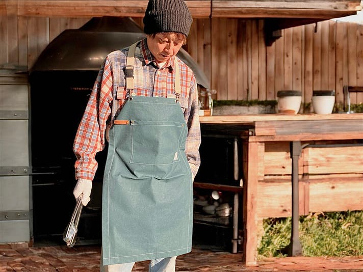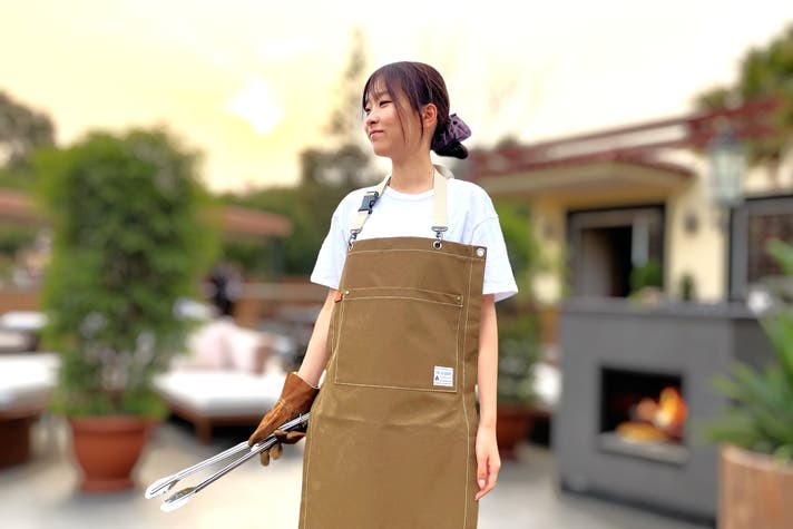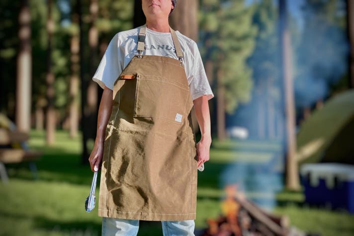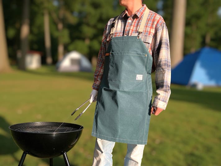 アウトドアレジャーや、キャンプに行った時に食材や道具をトートバッグの状態の『APTON』に入れて持ち運び、調理が始まればファスナーをサッと左右に引っ張ればバッグがオープンして、すぐにエプロンとして着用可能です。