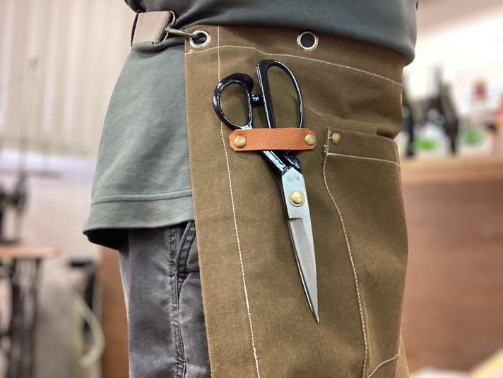サイドに付いた革ループに、ハサミ等の道具を通して使えるので便利!