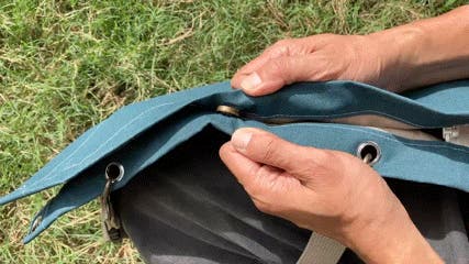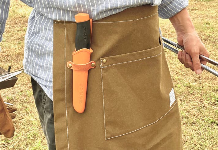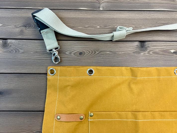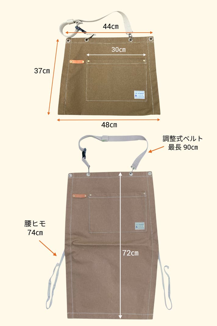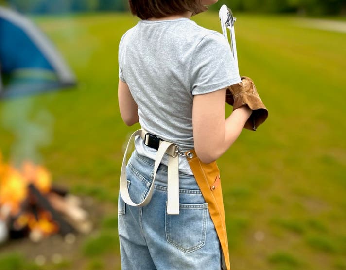 ナスカンを外してハトメ目の位置を変えることで、腰巻きのエプロンにも出来る!