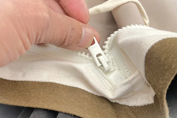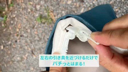 ファスナーを止める時は、左右の引き具を近づけるだけパチっとはまる!