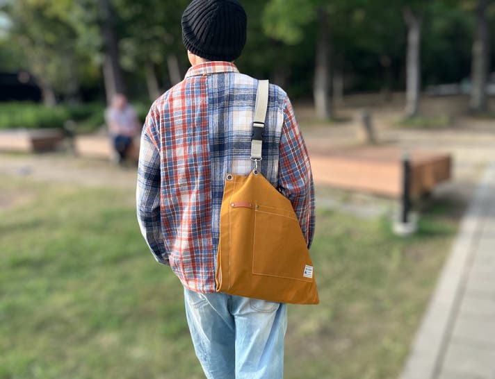 生産背景の諸事情により、同じ内容の製品は、生産継続が難しい状況にありましたが、コンセプトは残して新たな製品の試作を続けていました。まだ世の中に無く、そして「あって良かった!」と思って頂けるアイテムの企画は、非常に困難を極めましたが、ファッションの枠に囚われず、広くニーズのあるアイテムとして「エプロンをカバンに出来ないか?」という発想が生まれました。