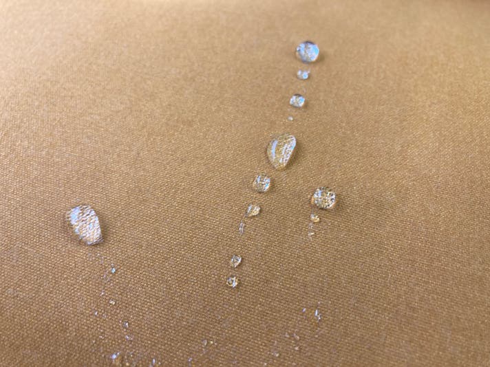 耐水性約1000㎜遮光性 99.998%難燃性 アメリカのテントの難燃基準にあたるCPAI84合格レベル。コート表面の撥水性は無く親水性(元が自衛隊天幕向けの表面コートなので撥水性が生む表面に水滴の玉が乱反射を呼び上空から発見されやすいので親水性になっています。)親水性とは濡れたような表面ですが水の浸入は防ぎます(防水性があります)
