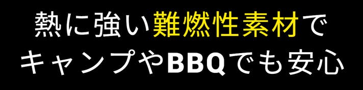 「APTON」は、一般的に熱に強いとされている綿をタテ糸に100%使用、ヨコ糸にはモダクリル繊維を使用した難燃性を向上させたアーミーダック生地(PROTEX®のGUNMAKU)を使用しています。化学繊維は着火すると溶解が起こり、それが肌につくと重大な火傷を引き起こす二次被害が起こります。モダクリル繊維PROTEX®のGUNMAKUで使用しているタイプは、炭化型の難燃素材で焦げる事で消化するため溶解による二次被害を防ぎます。焚火やバーベキューなど、常識の範囲内でのご使用でしたら問題なくご使用頂けます。