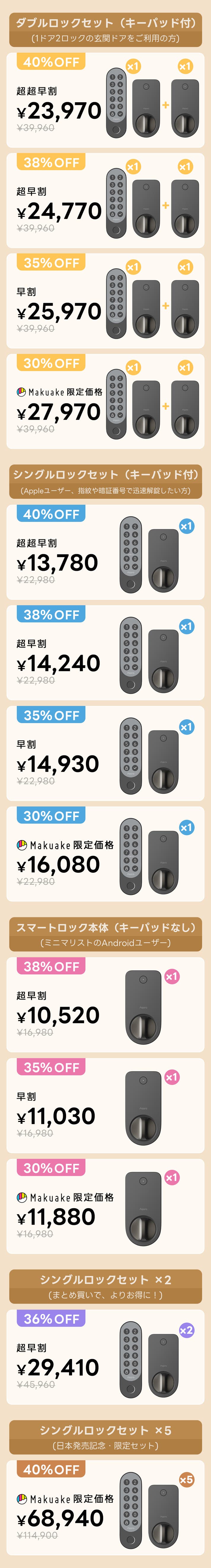 ※指紋・暗証番号・Appleホームキーでの解錠には、キーパッドが必要です。「ロック単体」ではこれらの機能は使用できません。「爆速解錠」をフルに体験したい方は、セット品をお選びください。