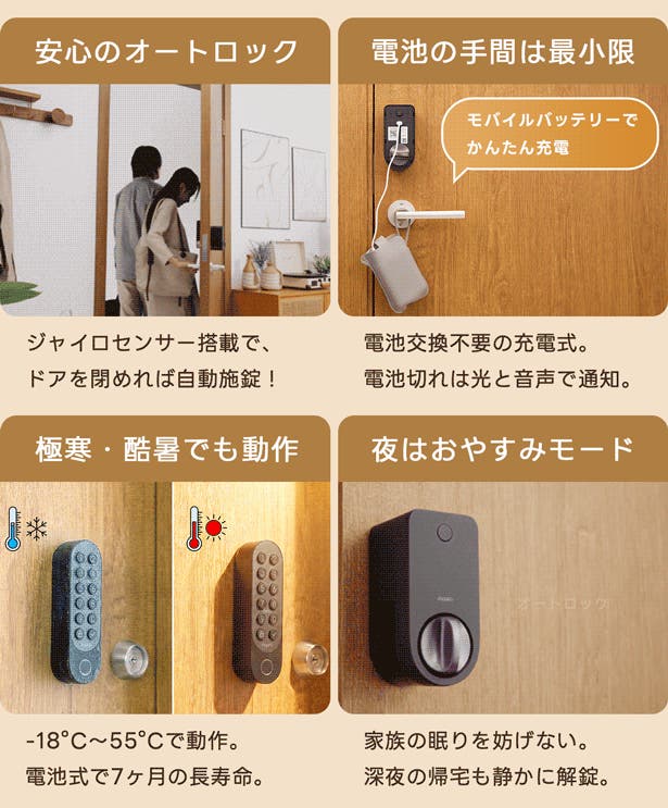 - 指紋や暗証番号、アプリで遠隔操作も実現。「安全かつ便利な」解錠を。カメラとの併用もおすすめ!