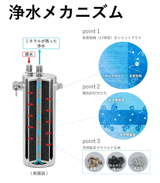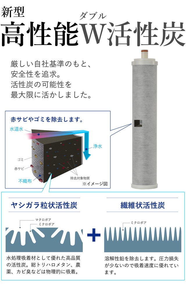 特別なW活性炭のカートリッジで「寿命を伸ばす」という方法でカートリッジ交換の頻度を少なくし、面倒な手間とランニングコストの両方を削減させることに成功しました!