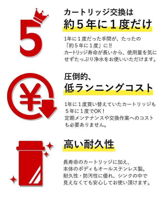 - カートリッジ交換は、たったの約5年に1度だけ!カートリッジ交換が面倒な方におすすめ