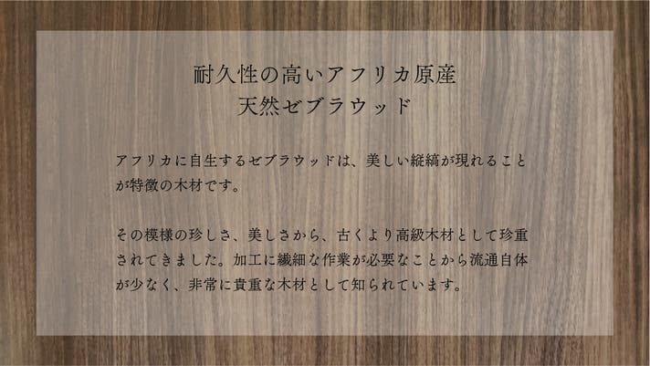 - 世界に一つだけの木目を持つ、貴重性の高いアフリカ原産の天然ゼブラウッドから削り出された一品。