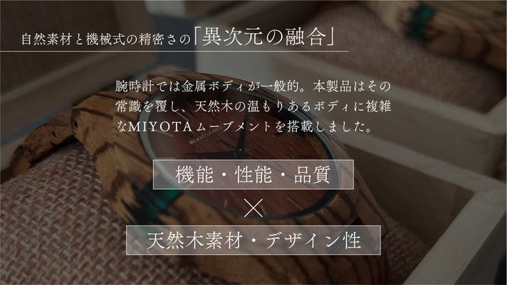 通常、精密機器である腕時計ムーブメントは金属ボディであることが一般的です。本製品はその常識を覆し、天然木の温もりあるボディに複雑なMIYOTAムーブメントを搭載しました。