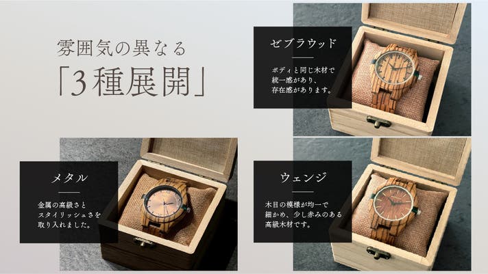 ボディやベルト部分は共通してゼブラウッドですが、文字盤は雰囲気の異なる3種類を用意しました。ご自身に合ったお好みの種類をお選びいただけます。